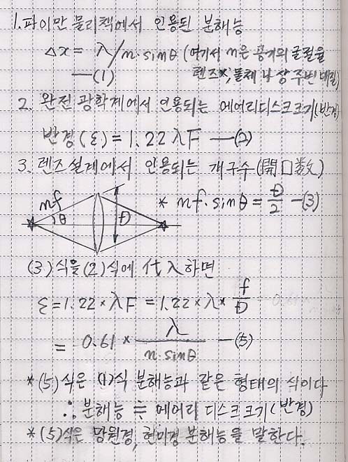 n=1이 아닌 상태를 고려해야겠지요. 예를들어 수중 카메라의 경우나, 아니면 화성 탐사선의 카메라같이 주위가 엷어 n이 1이 아닌 경우를 말합니다. 이럴 경우 분해능은