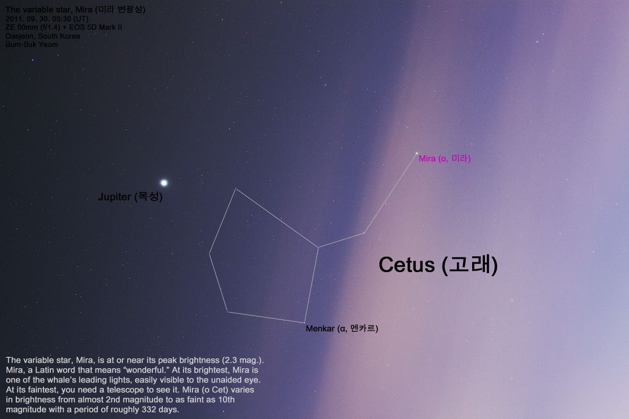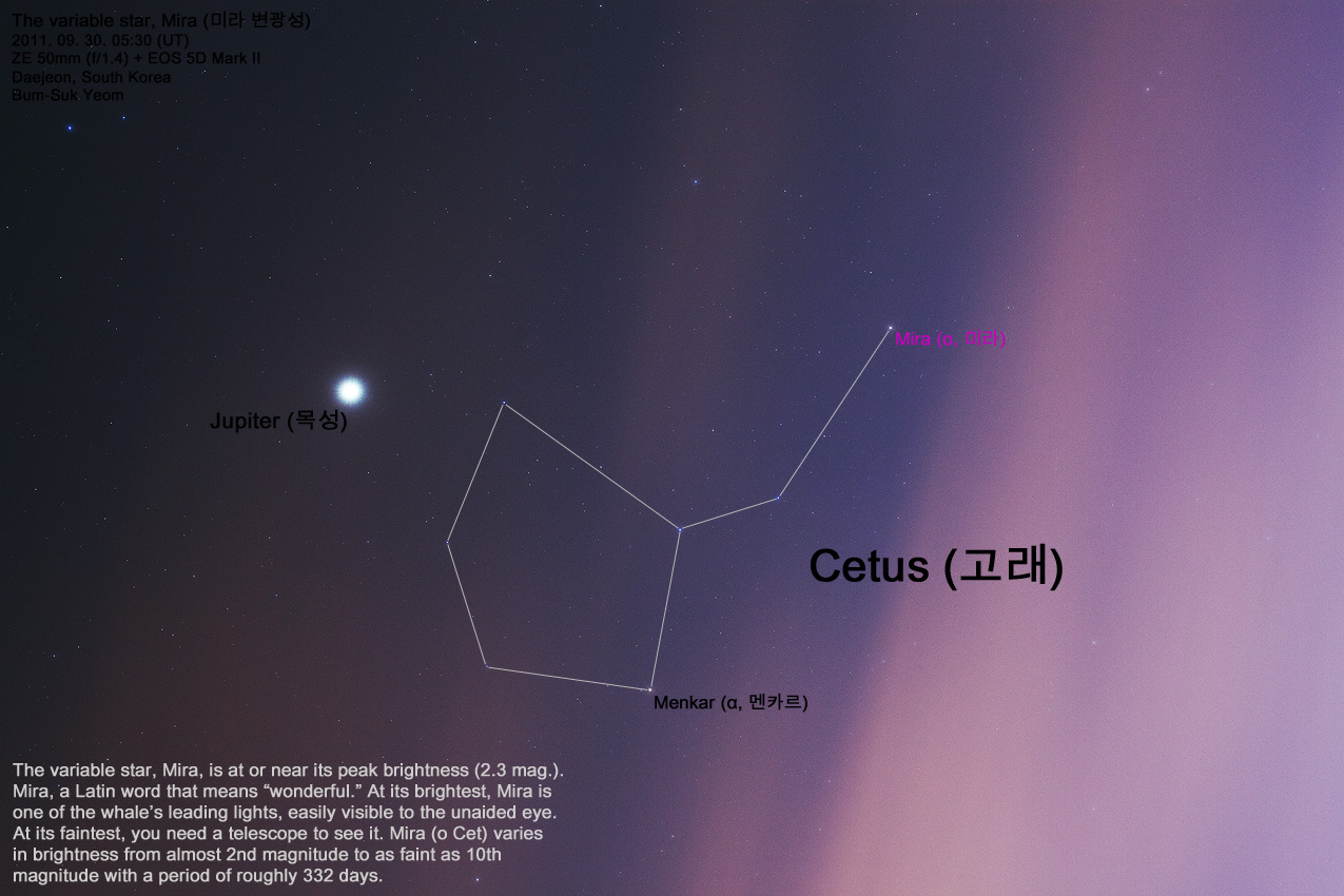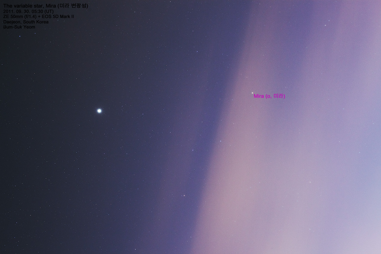 cf. 대전 도심에서 구름 또한 있는 하늘에서 촬영한 상황이라 단순히 주변 별들 (고래자리의 머리를 이루는 별들)과의 밝기 비교로 미라 변광성의 밝기가 어떤지를 살펴보기 위해 촬영한 사진입니다.
