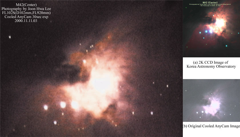 2000년 가을부터 다시 별보기에 관심을 갖고 웹캠(삼성애니캠)에 냉각장치를 붙이고, 장기노출되도록 개조한후 찍은 오리온자리 대성운 입니다. 볼품은 없지만 당시 저에겐 큰 즐거움을 주었던 사진입니다.