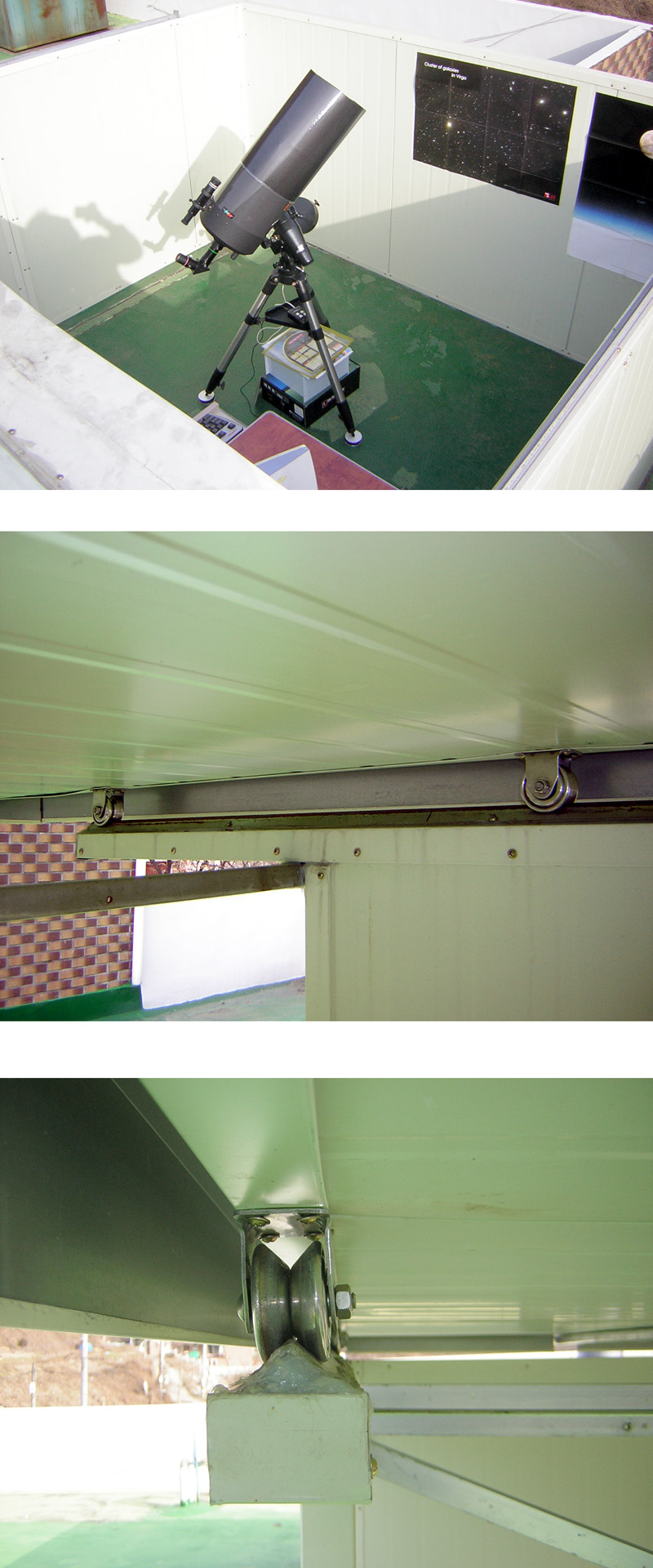 레일 기둥의 부실로 지붕을 이동시킬 때 좌우로 휘청거리는 것이 있었는데 양 기둥사이를 X자 모양으로 앵글을 연결해서 보강을 했더니 훨씬 좋아졌습니다.