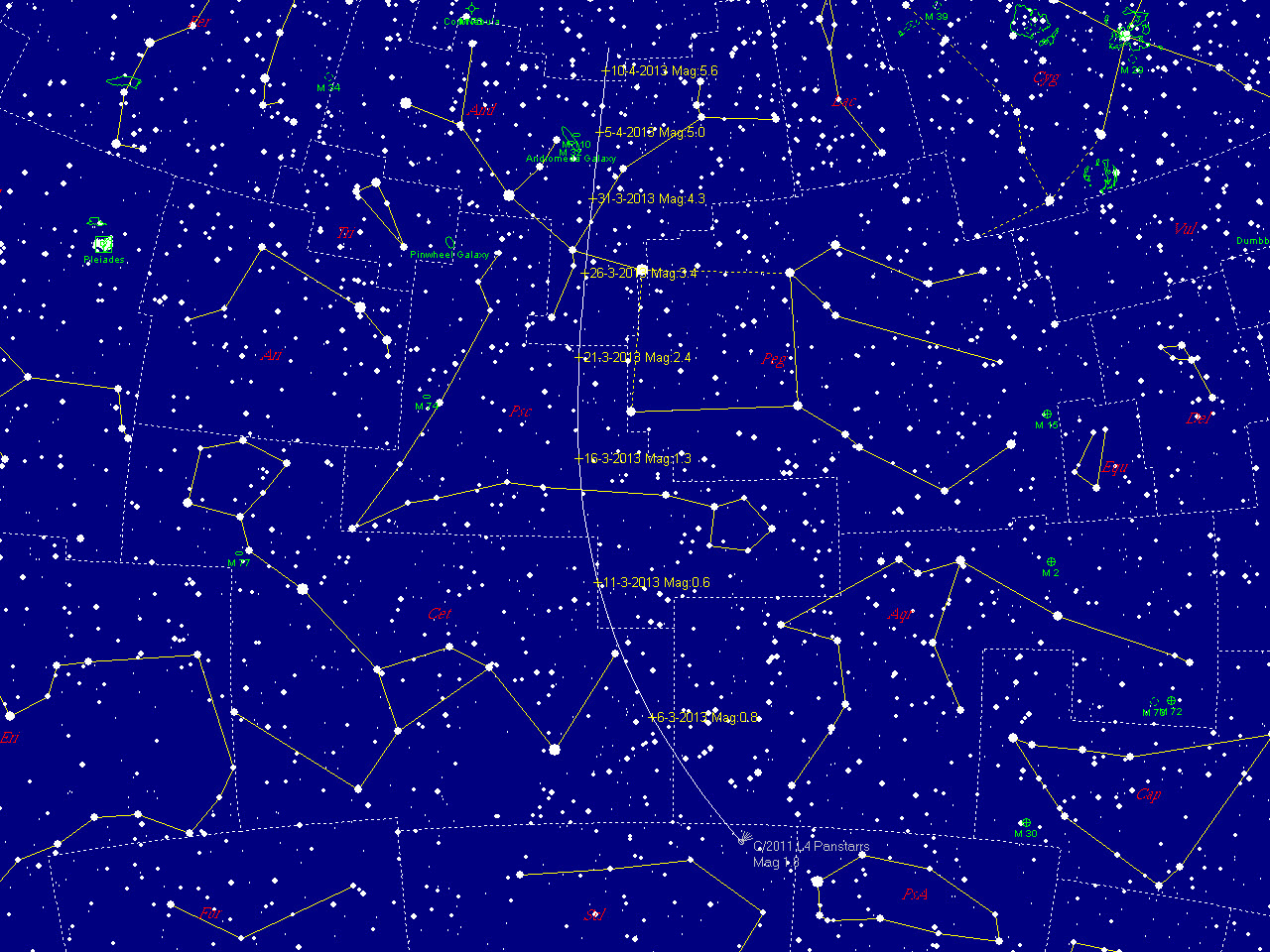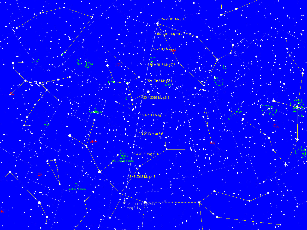 4월 5일에는 5.0등급으로 어두워지나 이 무렵 안드로메다은하의 2.5도 지점을 지나가