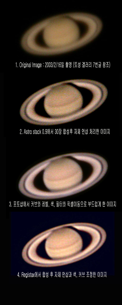 이는 유용한 정보에 합성 한계매수에서 언급한 바와 같이 목성의 경우 1분여 정도에 어느정도로 많이 찍을 수 있는냐 한 것인데 CP4500의 경우 100장 정도가 한계입니다. 이것에서 좋지않은 영상 버리면 70장에서 80장 정도가 한계가 됩니다. TouCam Pro의 경우는 1분여동안 1000여장 찍을 수 있으므로 로우 이미지가 질이 떨어지더라도 좋은 이미지 얻을 확률이 높아집니다. 토성의 경우 테의 디테일을 잘 표현 하고자 한다면 충일때를 가정해서 3분 정도의 영상을 찍어 합성한다고 보면 보통의 씽에서 엔케이 미니마 정도 찍히는 상을 얻어 낼 수가 있으며 토성의 벨트또한 EB(적도벨트) SEB(남 적도 벨트)STB(남 온대 벨트)SSSTB(남남남 온대 벨트)정도는 찍어 낼 수 있으리라 봅니다. 그러나