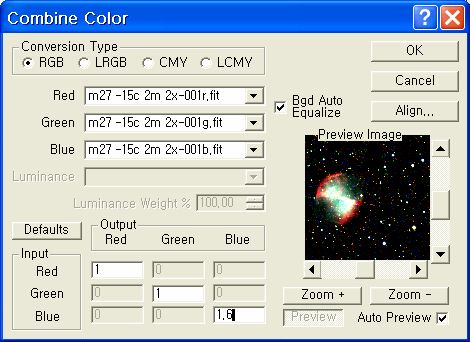 위에서 합성한 R, G, B 파일만 열어 놓고 메뉴의 Color – Combine Color를 실행합니다. RGB 파일 선택을 각각 채널에 따라 선택하고, Align을 정확히 하도록 정해주고 (Align 버튼을 눌러 실행) RGB 각 채널의 비율을 1:1:1.6정도로 맞춥니다. (센서나 필터에 따라 틀림)