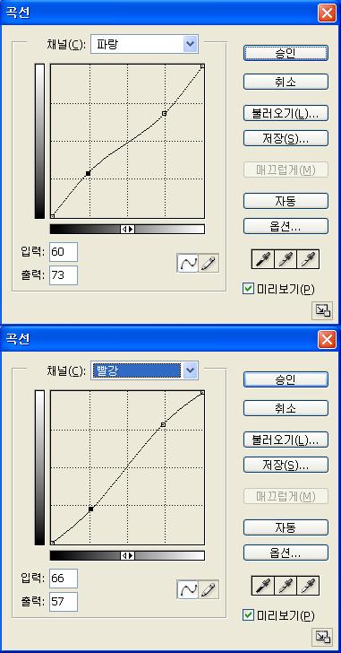 1. Blue 채널의 커브를 역S자형으로 조정합니다.(즉 밝은 영역을 내려주고, 어두운 부분을 약간 올려줍니다.)