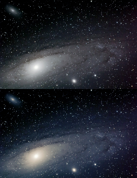 한가지 추가하자면 보통의 경우 은하의 중심부는 나이든 별들이 많은 관계로 주변부보다 적황색 편이를 띄는 것이 일반적입니다.