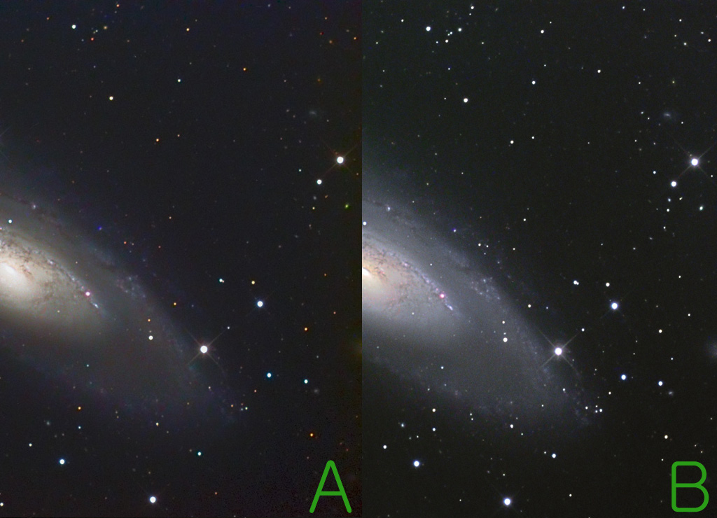 B 는 일전에 올렸던 M106 사진이고 A 는 오늘 새롭게 처리해본 이미지 입니다.