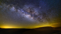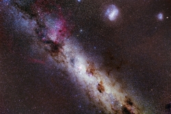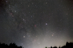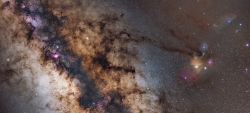 사진의 왼쪽에 밝고 붉은 천체가 화성, 중앙의 은하수안에 있는 밝은 천체가 토성, 그리고 오른쪽에 밝은 천체가 목성입니다.