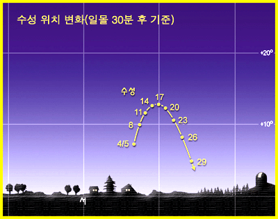수성은 지난 2월 서방최대이각일 때 새벽 하늘에서 볼 수 있었다. 그러나 이를 본 사람은 드물 것이다. 2월의 겨울 새벽, 따뜻한 잠자리를 물리치고 찬 기운으로 가득한 밖으로 나서는 것은 쉽지 않은 일이기 때문이다. 그런 면에서 이 달 17일 동방최대이각을 전후로 한 시기는 올해 수성 관측을 위해서는 최고의 조건이다. 우선 일몰 후 서쪽 하늘에서 볼 수 있다. 그리고 고도도 충분히 높다. 17일 일몰 30분 후인 19시 40분 경의 고도가 13도에 이른다. 게다가 천문 박명이 시작되는 20시 10분 무렵에도 고도가 7도나 되기 때문에 서쪽 지평선 부근에 높은 산이나 건물 같은 장애물이 없다면 도심에서도 어렵지 않게 볼 수 있다. 이날 수성의 밝기는 0.3등급이다.