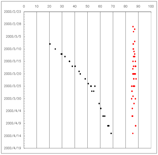 3월 8일에 암반이 STrZ의 II=20도에 형성되어서 매일 1.9도씩 후퇴를 했는데 3월 25일에 II=54도에 도달하면서 후퇴속도가 매일 0.76도씩 느려지고 있습니다.