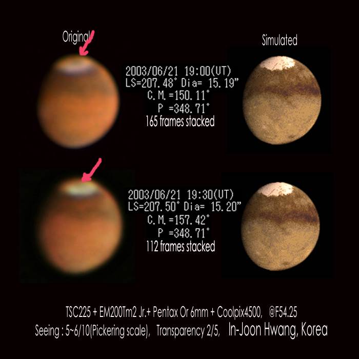 2001년 대접근때 관측이 되었던 먼지 폭풍 후에 화성의 대기에는 부유물질이 많아져서 대기의 기온을 예년보다 높게 하는 요인으로 작용 이에 따라 남극관의 성장을 방해한 것으로 생성되었을 당시부터 작았던 것으로 사료된다.