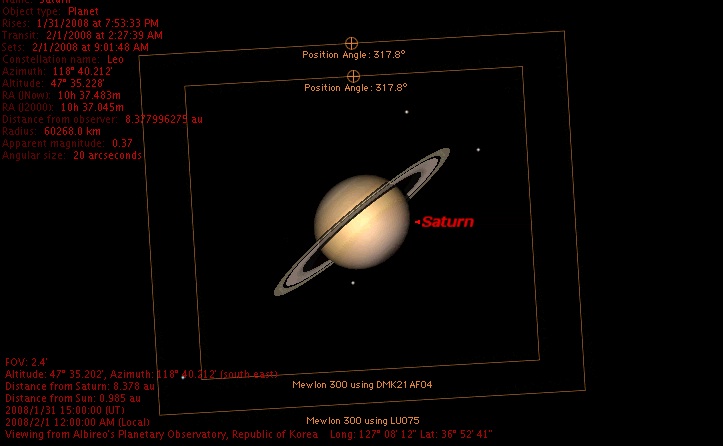 2007년 겨울을 화려하게 장식하던 화성은 점차 멀어져가고 이제 토성이 다가오고 있습니다. 올해 토성의 충은 2월 24일입니다. 지난 2003년 이후로 점차 기울어지고 있는 토성 고리의 각도는 이제 한결 얕아졌습니다 - 2009년 9월 께 가장 얇아 보이고 이후 다시 기울어지게 될 것입니다.