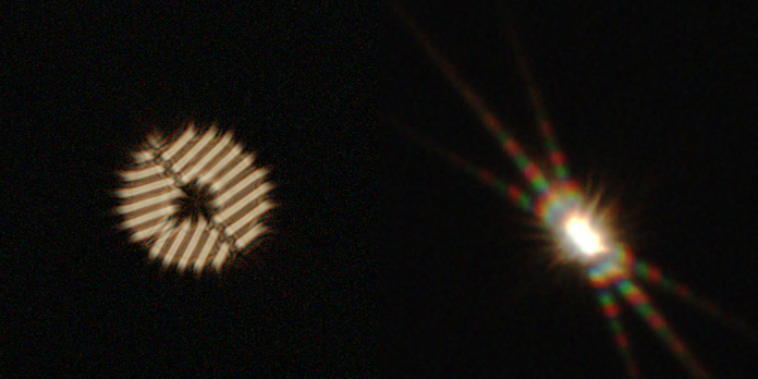 * 가운데 밝은 별빛 때문에 회절무늬선이 잘 안 보입니다. 회절 무늬선이 잘 보이도록 히스토그램을 조절해서 보는 것이 요령입니다.