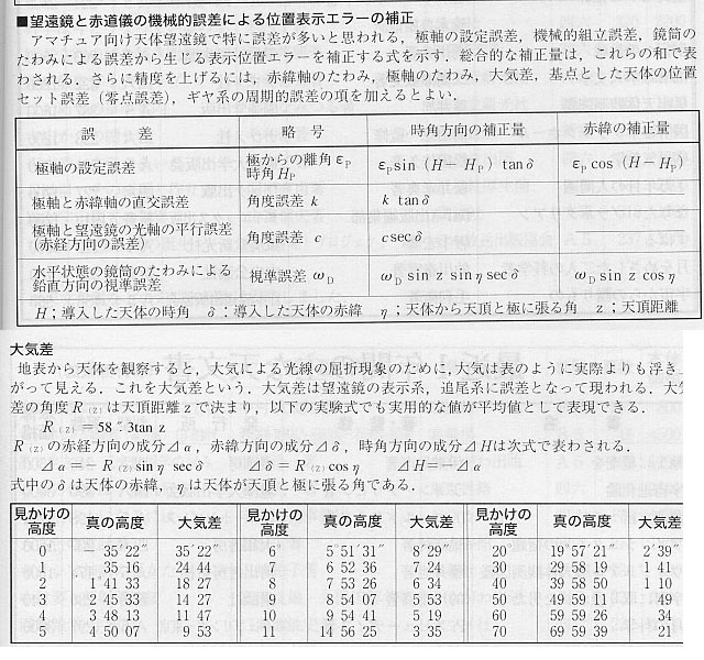조견판 극축 맞춤도 가대가 돌아가므로 사진촬영은 당연히 가능하겠지요. 그러나 5분간 노터치 가이드를 하여 대상물을 확대하여 보면 정확한 극축맞춤과는 그 극축 틀어짐 각도만큼 그 차이가 분명히 있습니다. 위 내용은 적도의 식 가대의 중요 극축 오차 4항목인데 제일 위 항목인 설정 오차의 비율이 제일 큽니다. 이 자료는 천문년감 자료입니다. 여기서 제일 위 항목의 적위의 보정량의 의미는 자오선 가까이 있는 별을 찍을 경우 극축 틀어짐 각도만큼 100% 그대로 별을 보정해주라는 의미이고 이 값이 제일 큽니다(H-Hp=0이되고 cos 성분은 1이 되므로). 이 말은 극축의 설정 오차의 요인이 별이 흐르는 가운데 가장 큰 요인이라는 것입니다. 2, 3, 4항목은 과거에 임의로 값을 넣어서 계산해본 적이 있는데, 그 비중이 그리 크지 않습니다(sin 성분이 들어가므로). 만약 위의 네항목을 모두 보정한다면 가이드장치는 필요없다는 얘기이므로, 거꾸로 말하면 흐르는 비중은 설정오차의 비중이 가장 큽니다. 그런데 설정오차가 큰 조견판이나 정밀한 극축 맞춤이나 별로 차이가 없다면 가이드 망원경에 의한 가이드도 필요 없을겁니다.