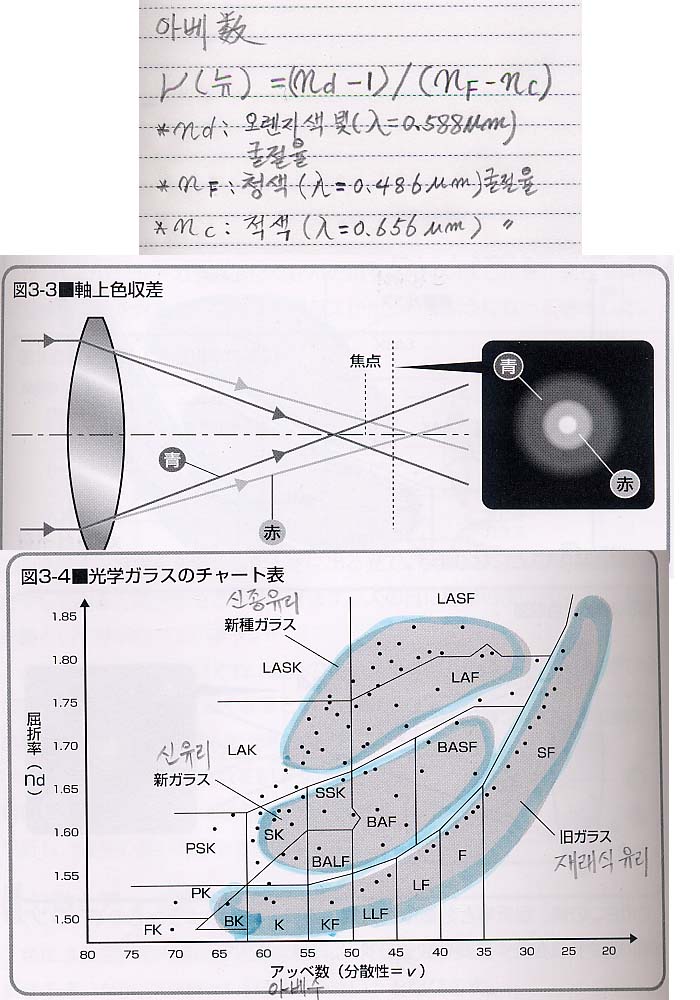 제일 아래 그림 챠트는 가로축이 아베수이고 세로축은 오렌지색 굴절율일 때 각 렌즈 재질 분포도입니다. 재래식 유리를 보면 BK~SF 재질이 있습니다(BK는 김병현이 아님). 통상 아베수 50~55 이상이면 크라운유리라고 말하는데 창유리로 사용되는 소다 유리를 광학용으로 개량한 것입니다. 50~55 아래는 플린트 유리라고 하여 납성분이 포함된 유리입니다. 지금은 납이 환경 오염물질이므로 납성분을 제거한 플린트유리가 사용되고 있습니다.